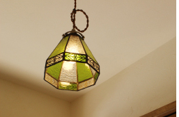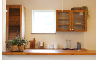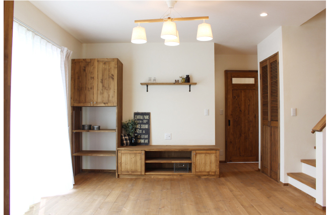白壁にパインが映える家